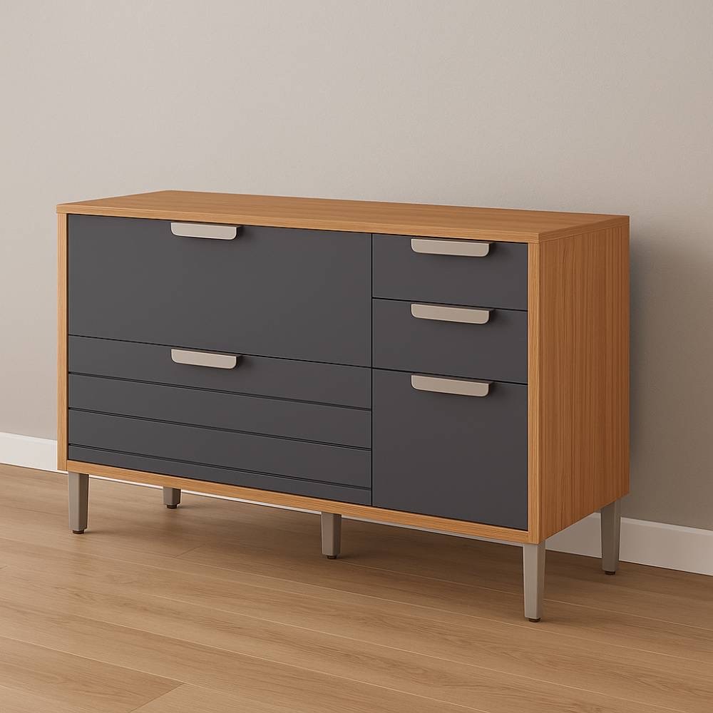 Gavetas Telescópicas: As 4 gavetas contam com trilhos telescópicos de abertura total, proporcionando um manuseio extremamente leve e acesso completo aos itens do fundo. Uma das gavetas possui acabamento frisado, agregando textura e modernidade.