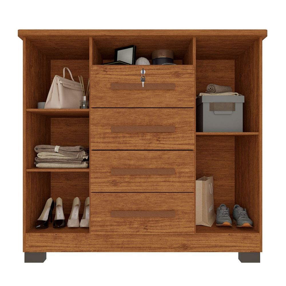Comoda Versalhes possui 4 gavetas, sendo uma com chave e duas portas, espaço para prateleiras ou o cabideiro incluído. Tudo isso com excelente distribuição interna, proporcionando uma boa acomodação, inclusive de camisas e blusas.
