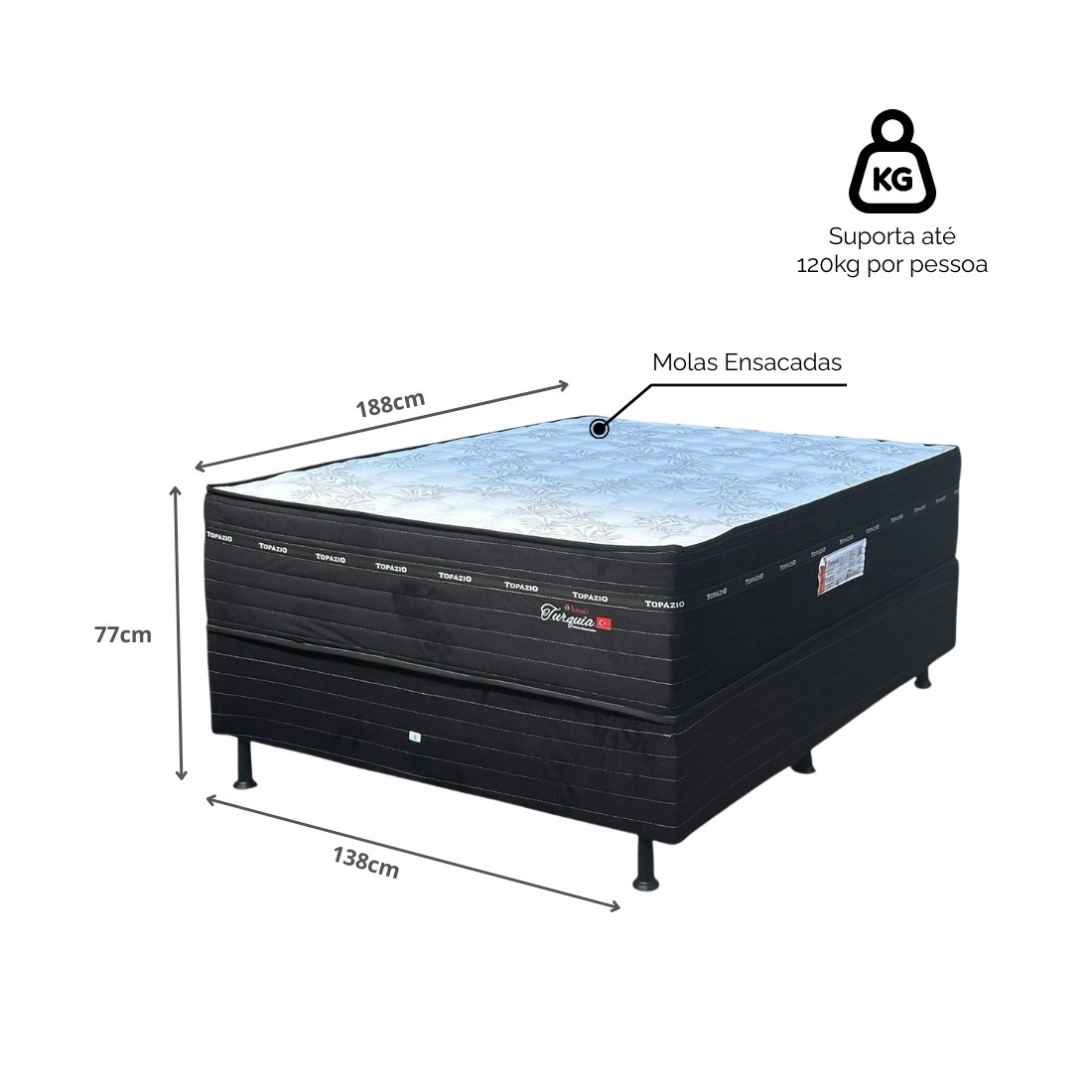 AdicionarO Conjunto Topázio Turquia Casal combina tecnologia de molas ensacadas com espuma de alta densidade para noites de sono revigorantes. Com molas ensacadas individuais, espuma D26 e capacidade para 120kg por pessoa, ele oferece suporte anatômico e durabilidade, perfeito para quem busca qualidade e conforto superior.