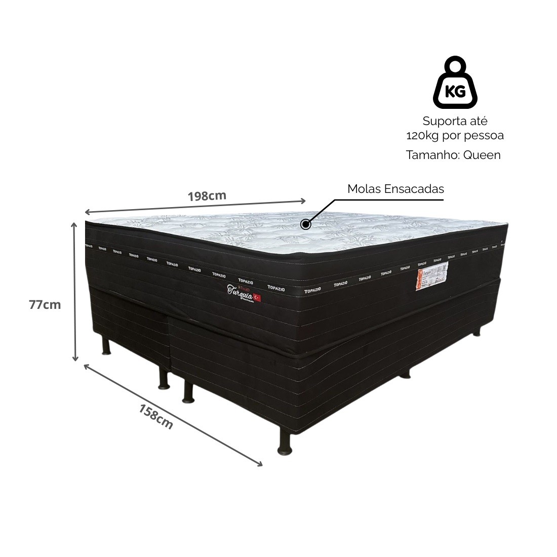 AdicionarO Conjunto Topázio Turquia Casal combina tecnologia de molas ensacadas com espuma de alta densidade para noites de sono revigorantes. Com molas ensacadas individuais, espuma D26 e capacidade para 120kg por pessoa, ele oferece suporte anatômico e durabilidade, perfeito para quem busca qualidade e conforto superior.