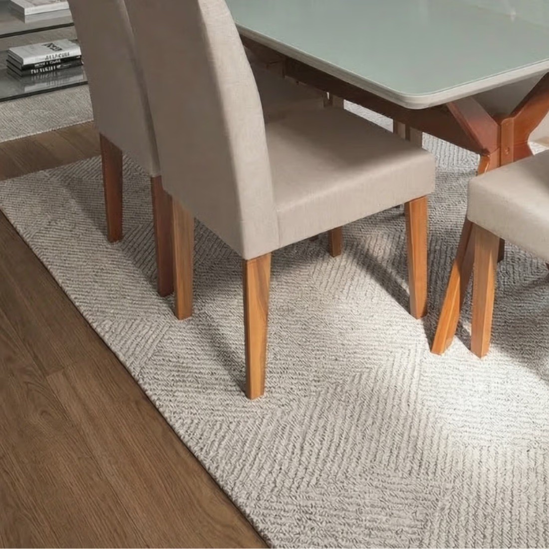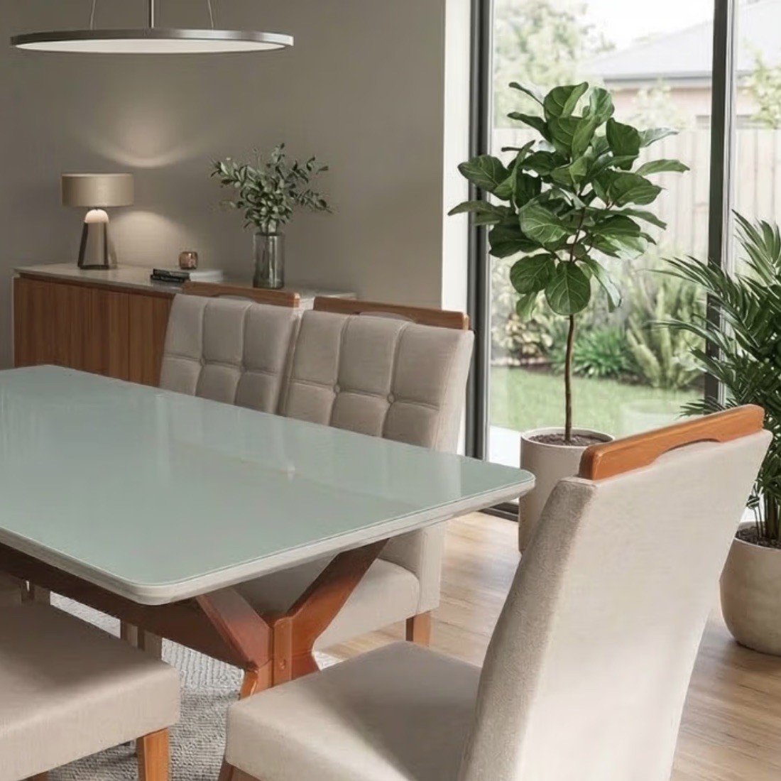 A Mesa Elegância, com tampo de vidro de 4mm sobre MDF de 18mm e base em madeira maciça, oferece um toque de elegância e robustez. As Cadeiras Pérola, com estofamento em linho na cor bege/cinza, proporcionam conforto e um toque moderno.