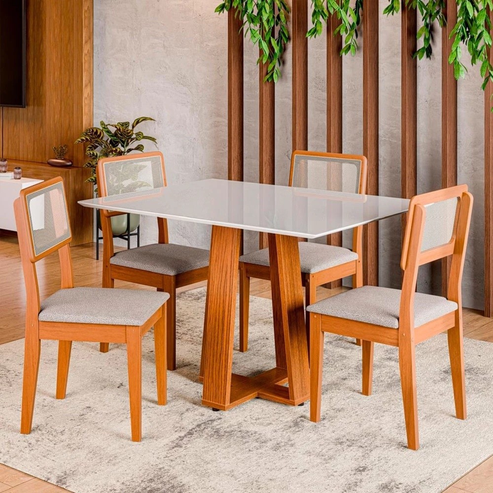 A mesa tem tampo em MDF de 18 mm com vidro e bordas chanfradas, conferindo leveza visual e segurança. Seu formato em “cruz” proporciona o encaixe perfeito das cadeiras, otimizando o espaço. Já as cadeiras trazem assento com espuma D20, tela sintética e detalhe superior levemente curvado, que valoriza ainda mais o visual contemporâneo do conjunto.