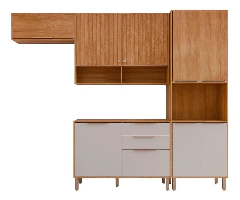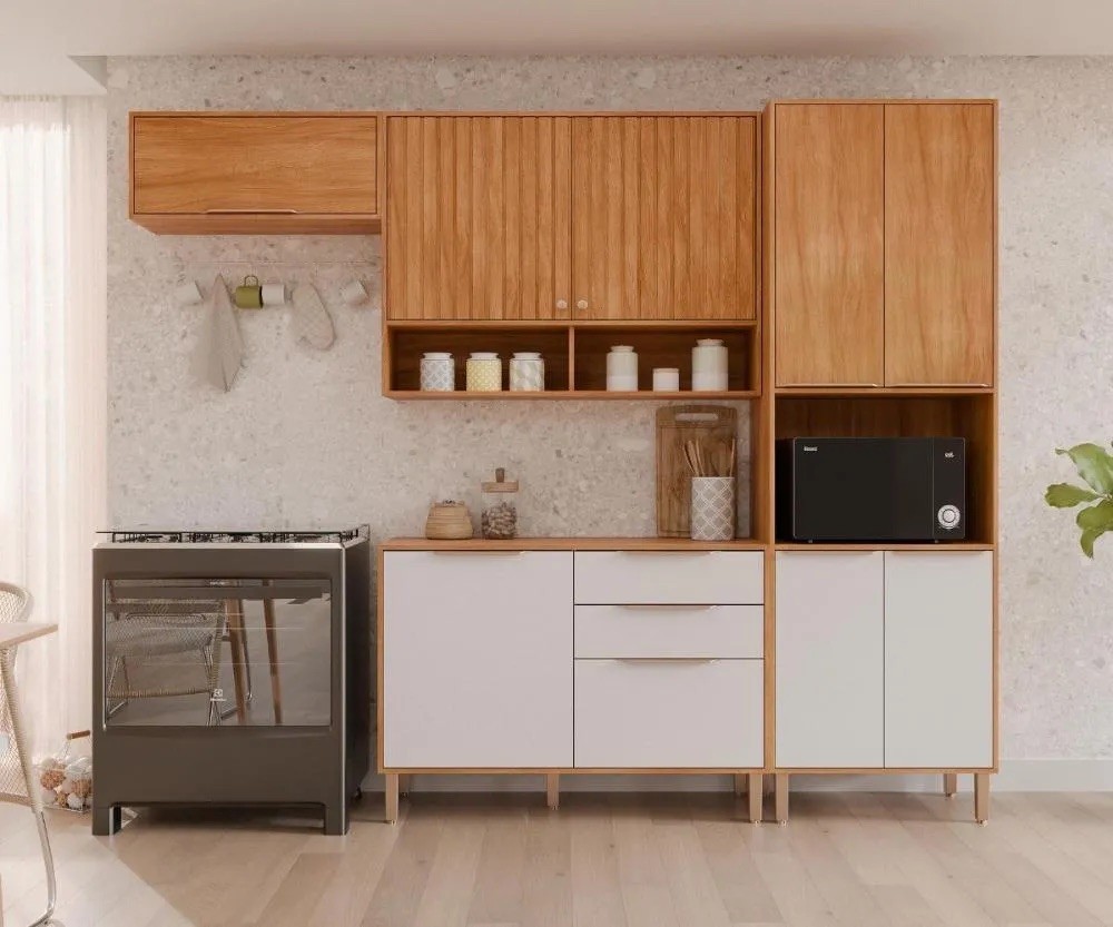 A Cozinha Modulada Divina da MGM Móveis é a escolha definitiva para quem busca o visual de um móvel planejado com a durabilidade do 100% MDF. Unindo o acabamento amadeirado Cinamomo com a elegância do Off White, este conjunto de 4 peças oferece ferragens de luxo e aproveitamento máximo de espaço. É a solução perfeita para uma cozinha moderna, resistente e funcional.