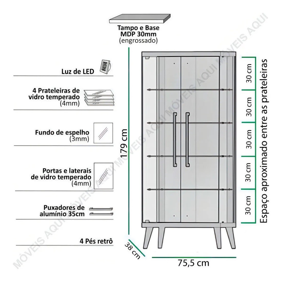 - Prateleiras: 4 prateleiras vidro temperado 4mm