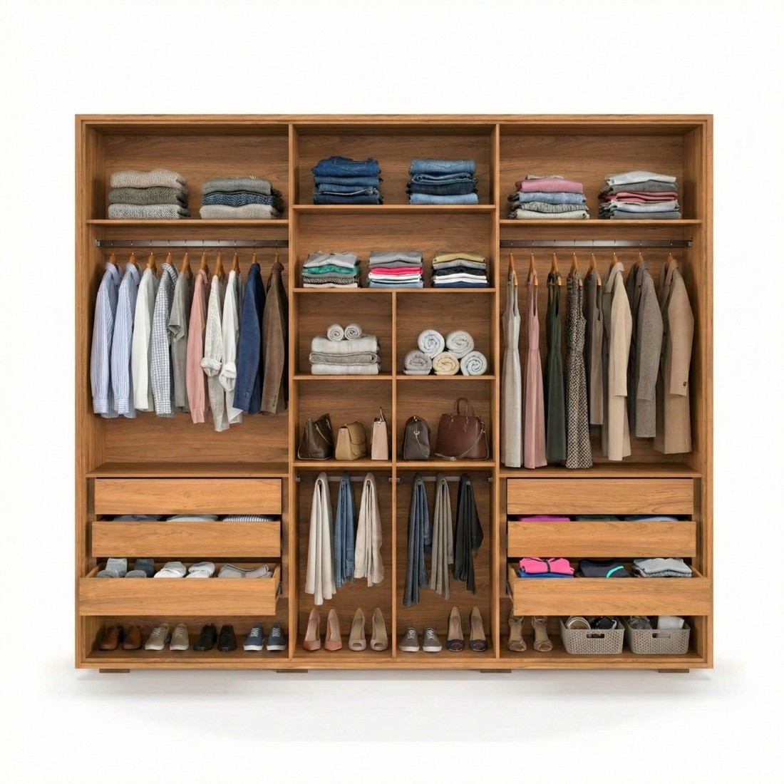 Com 6 gavetas amplas com corrediças telescópicas, o guarda-roupa oferece espaço de sobra para roupas íntimas, acessórios e objetos diversos. Inclui 4 cabideiros em alumínio reforçado para roupas longas, colmeia com 4 prateleiras móveis, 3 prateleiras superiores (maleiro) e uma prateleira central fixa. Há também espaço dedicado para calçados logo abaixo das gavetas.