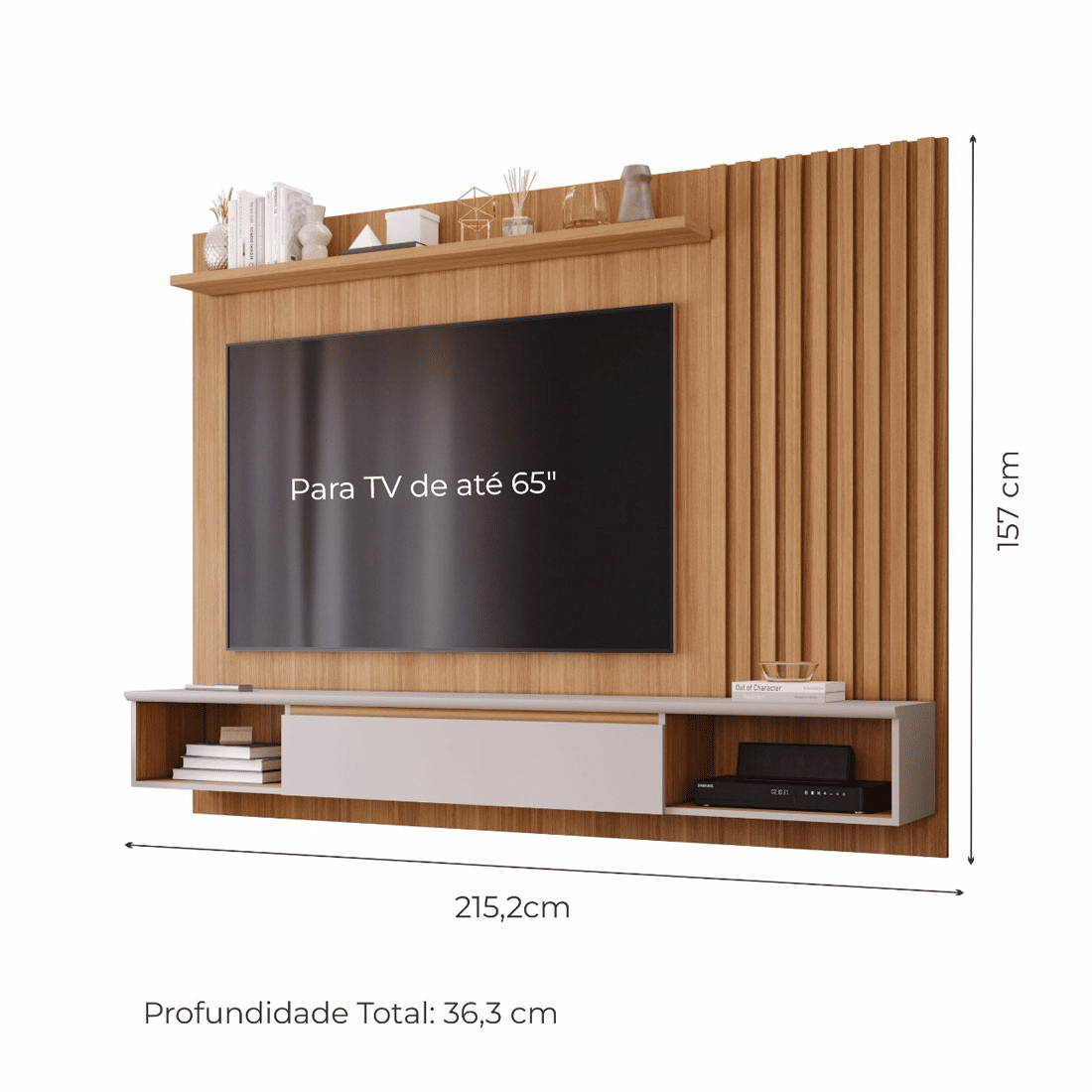 Transforme sua sala de estar com o Painel Suspenso Bahamas Plus da Permóbili! Com design sofisticado que combina aplique ripado, nichos organizadores e porta basculante, este painel oferece a solução perfeita para quem busca beleza e funcionalidade em um único móvel.