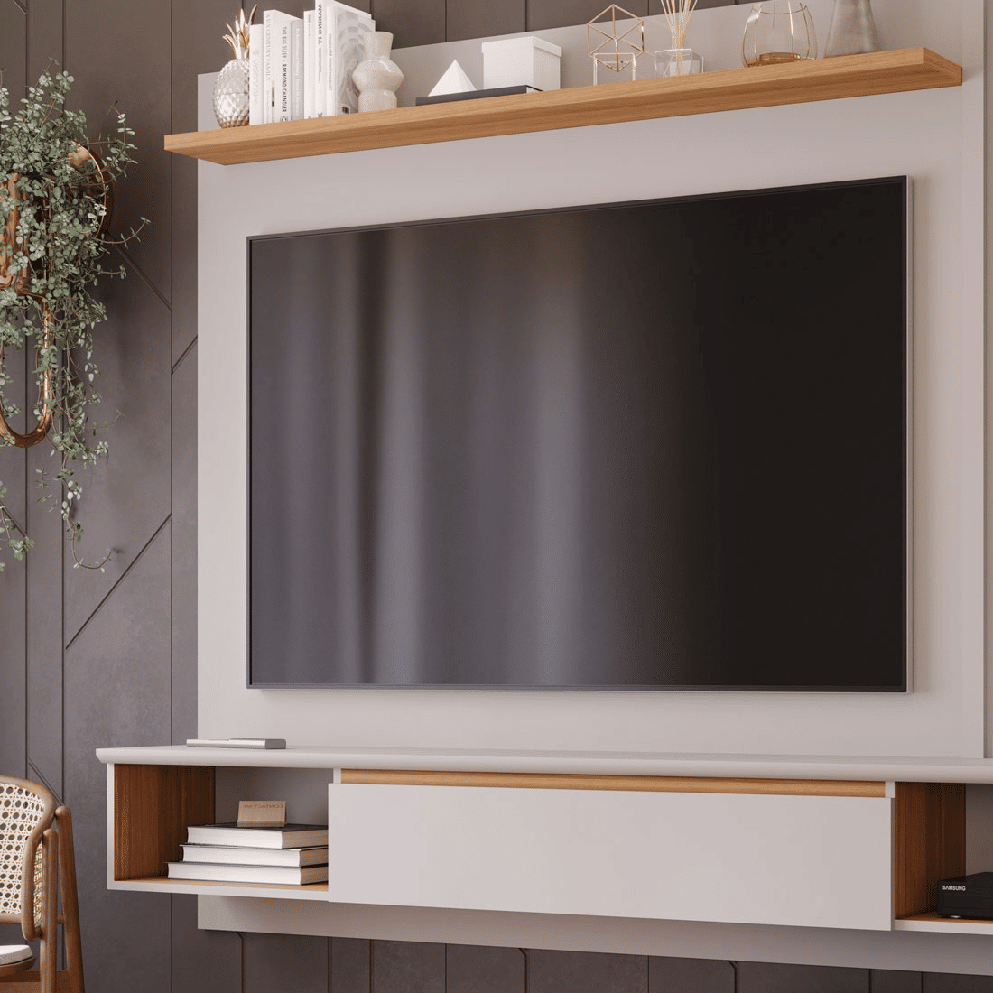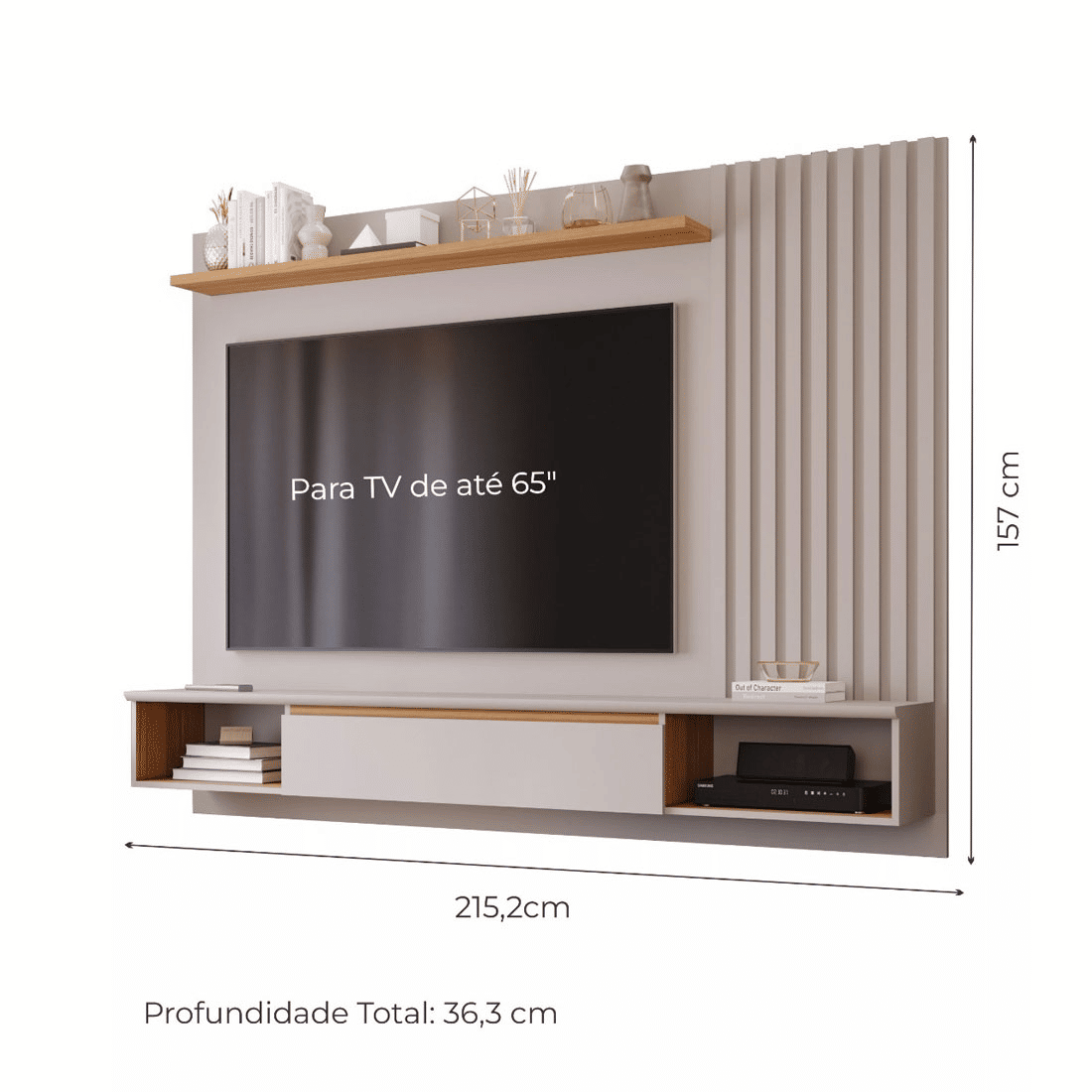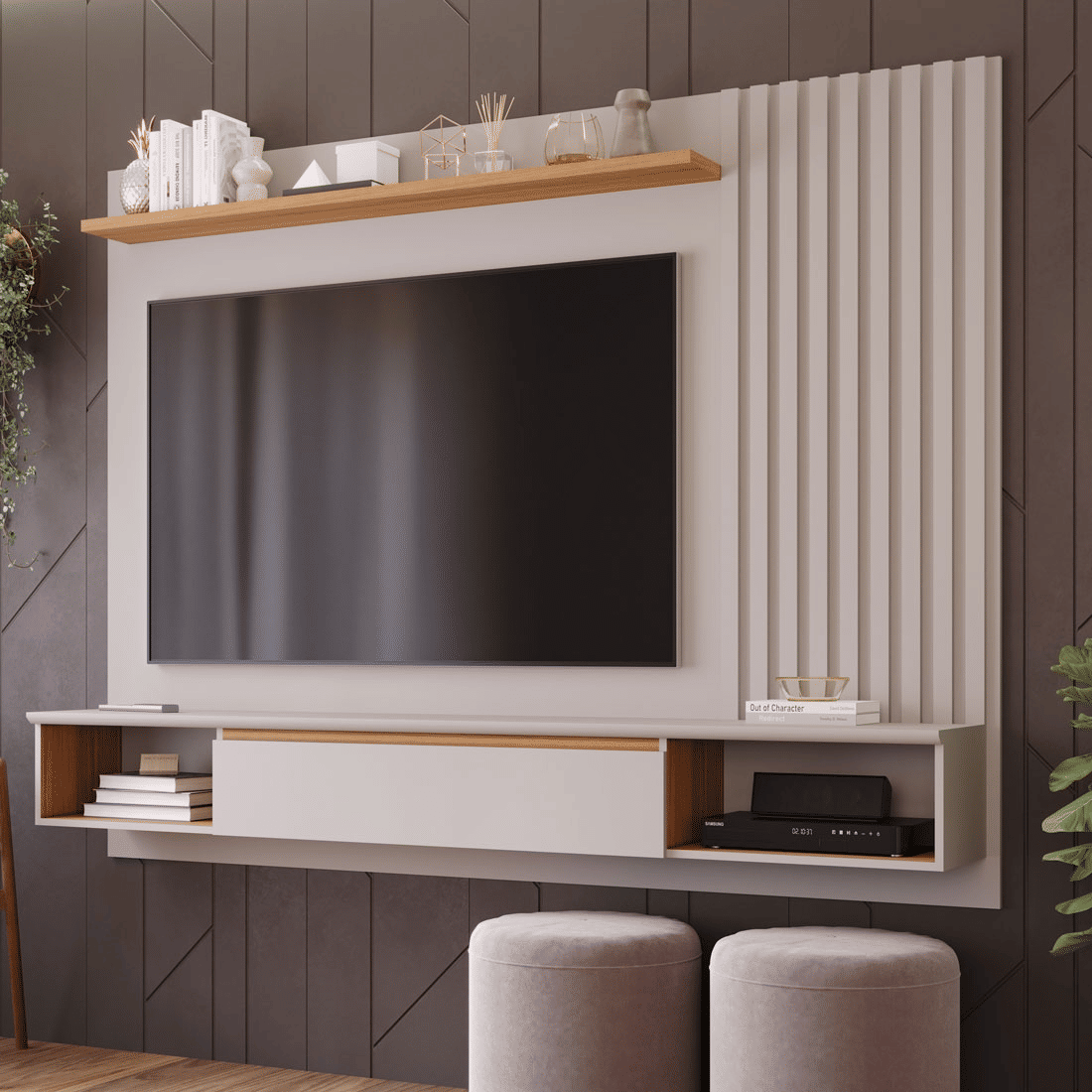 Transforme sua sala de estar com o Painel Suspenso Bahamas Plus da Permóbili! Com design sofisticado que combina aplique ripado, nichos organizadores e porta basculante, este painel oferece a solução perfeita para quem busca beleza e funcionalidade em um único móvel.
