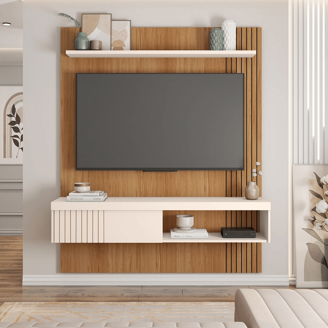 O Painel Jade 1.5 da Caemmun é a peça que faltava para elevar o nível de sofisticação da sua sala de estar. Projetado para quem busca um visual moderno e limpo, este painel combina a textura acolhedora do Freijó com a elegância do Off White. Com 1,50m de largura e detalhes que simulam o ripado autêntico, ele é a solução ideal para transformar paredes vazias em um centro de entretenimento digno de revista.