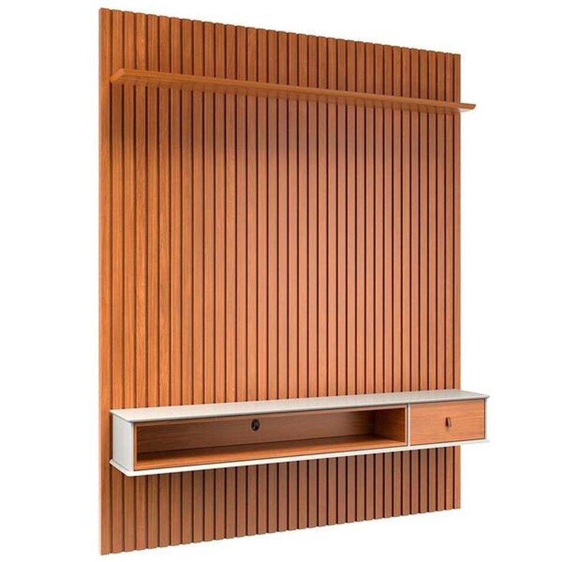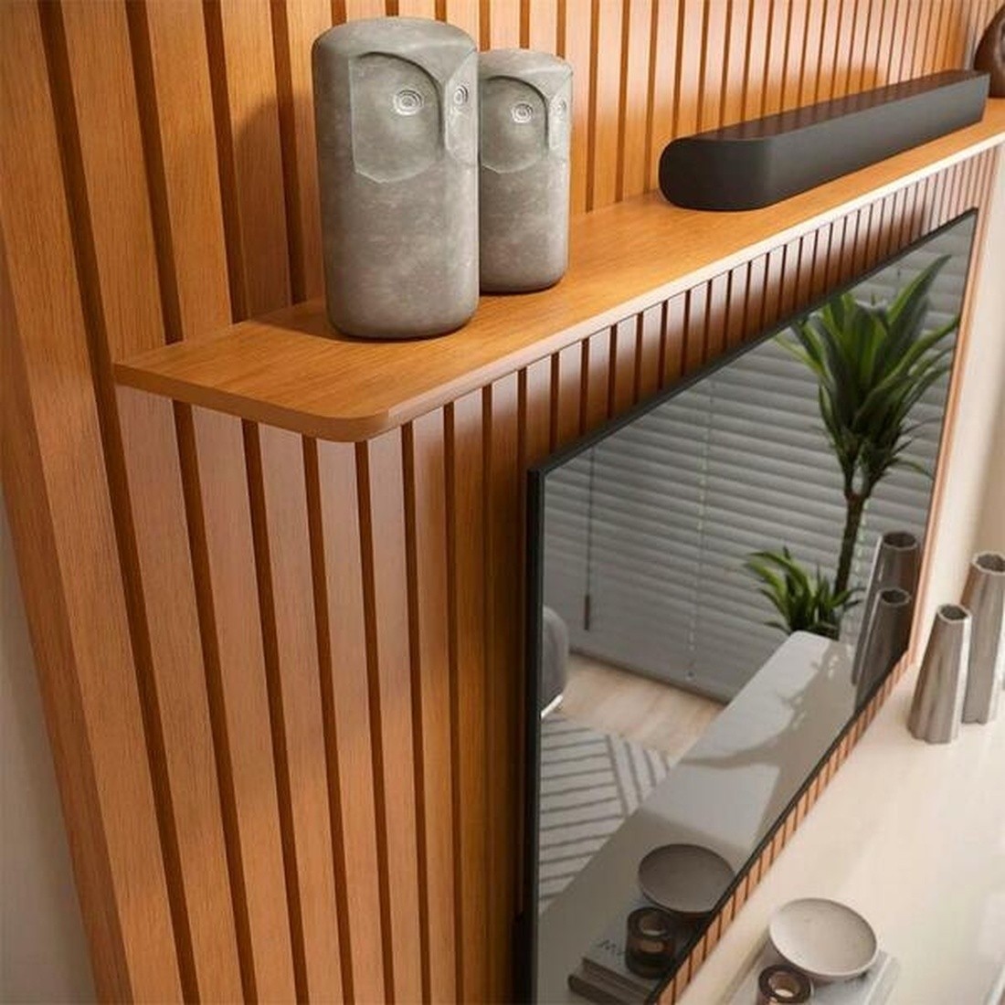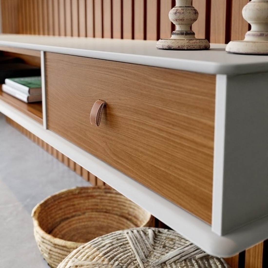 A estrutura suspensa conta com 1 prateleira superior, 1 nicho para eletrônicos e 1 gaveta com puxador em couro, ideal para guardar controles, mídias e pequenos objetos sem deixar nada espalhado. O design ripado vertical traz sensação de sofisticação e combina com vários estilos de móveis e cores de sofá.