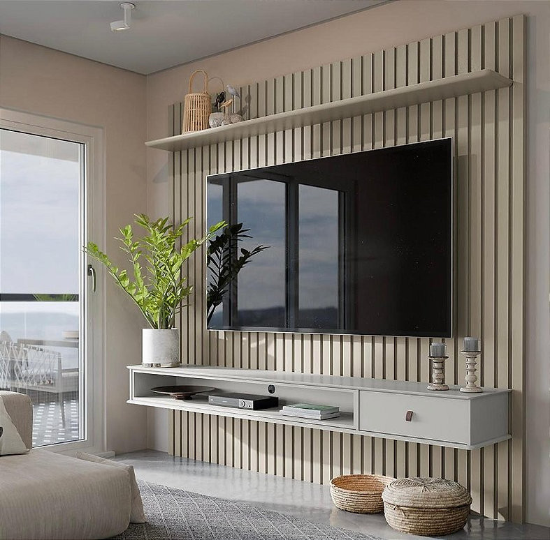 A estrutura suspensa conta com 1 prateleira superior, 1 nicho para eletrônicos e 1 gaveta com puxador em couro, ideal para guardar controles, mídias e pequenos objetos sem deixar nada espalhado. O design ripado vertical traz sensação de sofisticação e combina com vários estilos de móveis e cores de sofá.