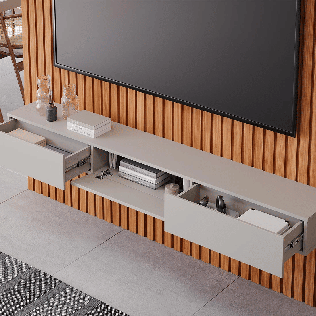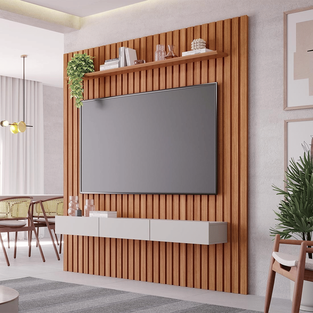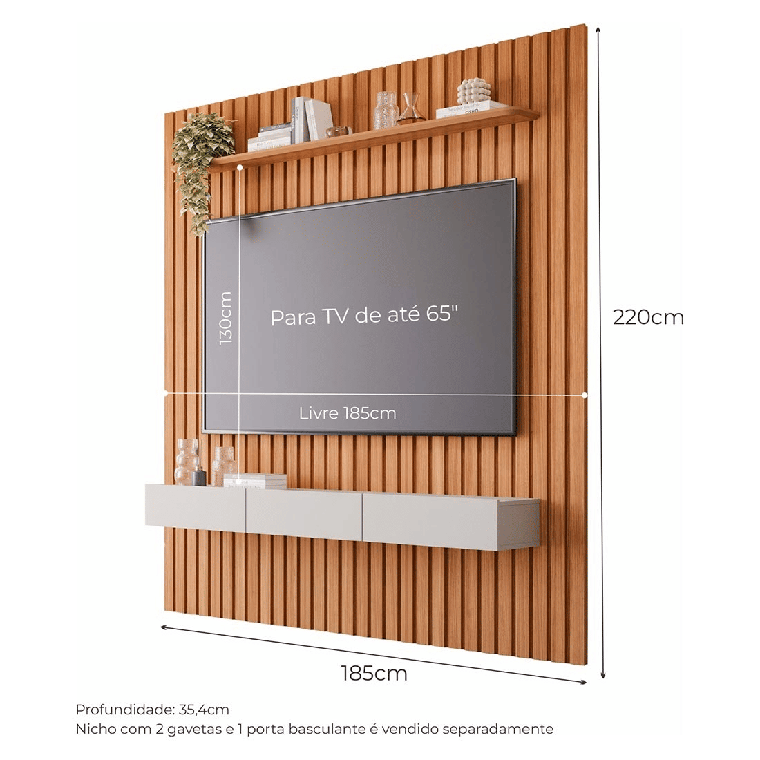 Dimensões Ideais: Com 185cm de largura e 220cm de altura, o painel comporta TVs de até 65 polegadas, com espaço livre de 160cm x 120cm para fixação. Tamanho perfeito para salas médias que não abrem mão de design e funcionalidade.