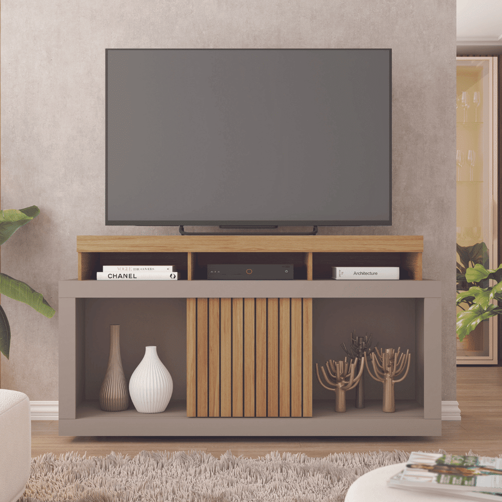 Nichos para Eletrônicos e Decoração: Com espaços abertos estrategicamente posicionados, o rack oferece ventilação adequada para consoles, receptores e aparelhos de som, além de prateleiras que valorizam seus itens decorativos favoritos.