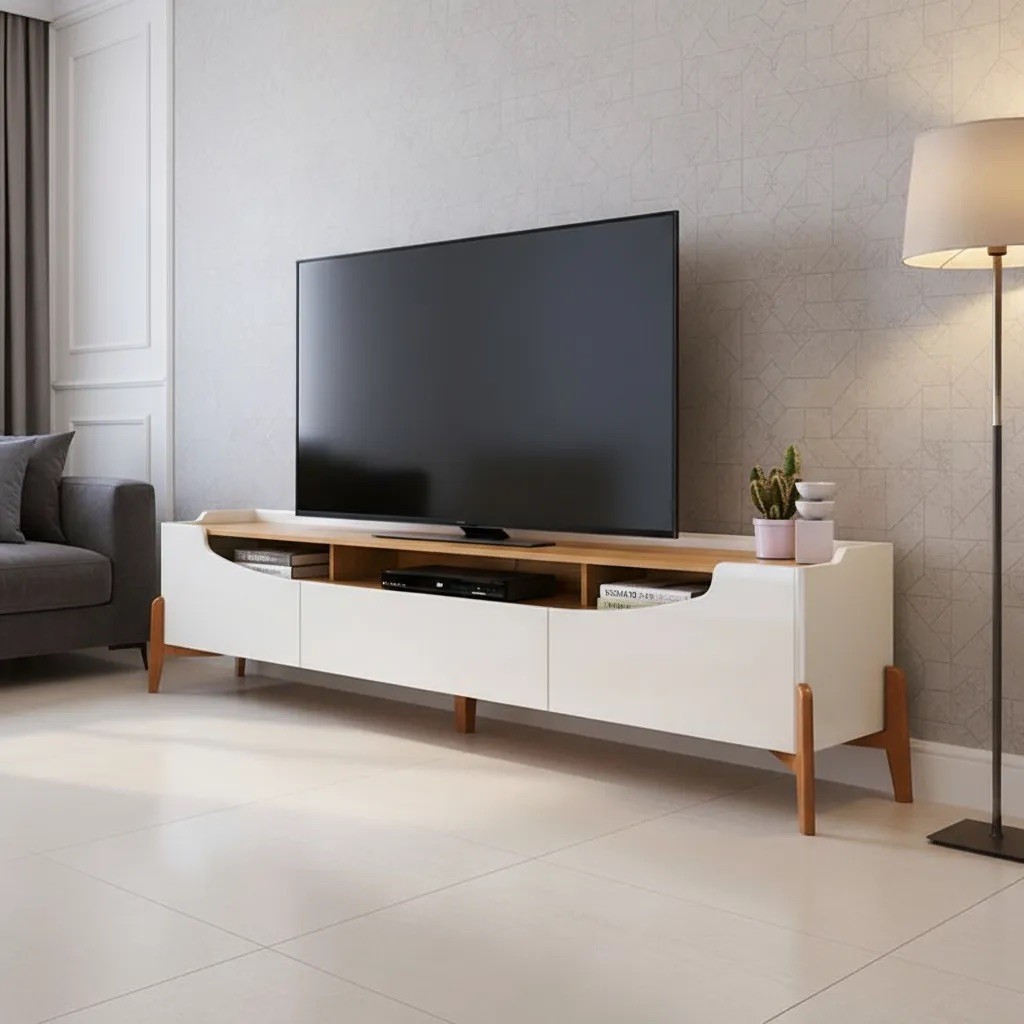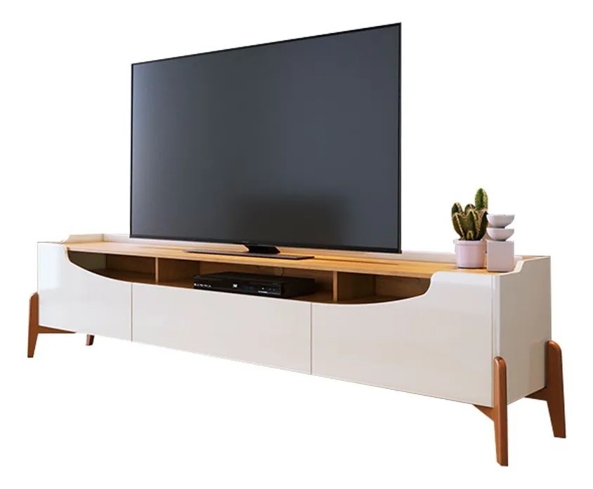 O Rack Studio 1.8 da Imcal Móveis é a solução definitiva para quem deseja transformar a sala de estar em um ambiente de alto padrão. Com generosos 1,84m de largura, este móvel combina a modernidade do Off White com o aconchego do acabamento Nature. Seus pés em madeira maciça e as bordas laqueadas reforçam a qualidade premium de um rack projetado para acomodar grandes telas com total segurança e estilo.