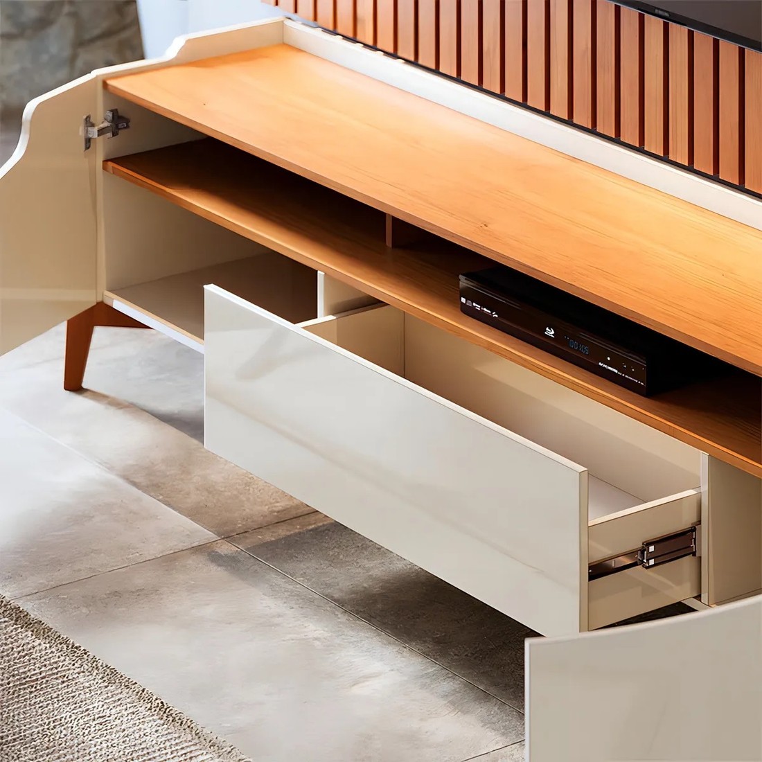 Gaveta com Corrediças Telescópicas: A gaveta central desliza suavemente sobre trilhos telescópicos, permitindo abertura total e organizada para seus acessórios. Além disso, conta com 3 nichos amplos para acomodar aparelhos eletrônicos com ventilação adequada.